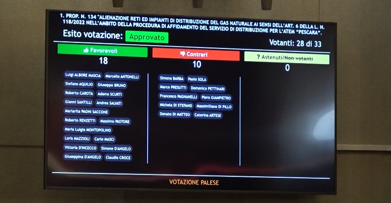 Pescara Consiglio Comunale: maggioranza compatta, sì alla vendita delle reti del gas. 18 voti favorevoli, 10 contrari.