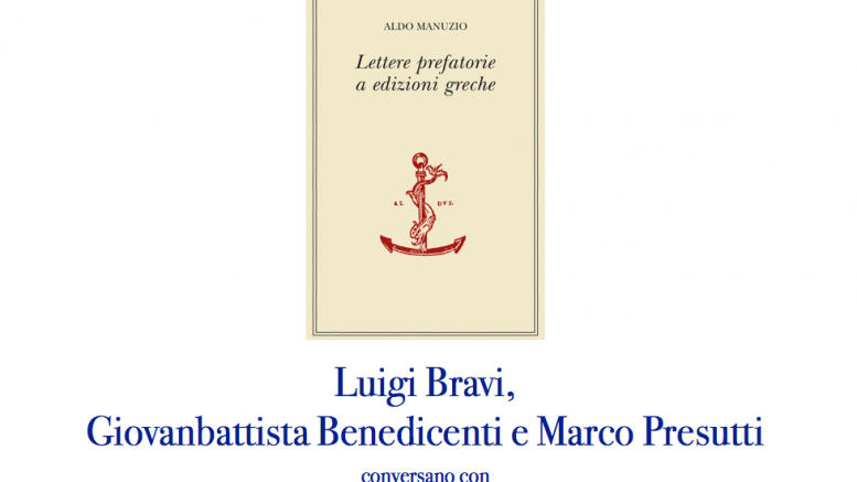 Gli organizzatori spiegano che “A Venezia «quasi una seconda Bisanzio» Aldo Manuzio concepì il progetto strardonariamente ardito di stampare i classici greci, il fondamento della cultura occidentale che per quasi un millennio aveva perduto la pratica della lingua ellenica. Un disegno rivoluzionario che comportava difficoltà tali da scoraggiare chiunque, giacché esigeva, oltre che un fiuto fuori del comune, collaboratori di prim’ordine e con competenze linguistiche per quell’epoca rare – persino a Venezia, dove pure viveva una florida colonia greca; e manoscritti, non meno rari, su cui fondare le edizioni; e incisori di eccezionale abilità tecnica, capaci di creare tipi che gareggiassero con la grafia dei più eleganti copisti. Senza contare la difficoltà forse maggiore: il numero, inevitabilmente ristretto, dei possibili acquirenti. Ma di fronte a questi scogli Manuzio non arretra: e vara il suo programma editoriale con la grammatica greca di Costantino Lascaris, procuratagli da uno scout d’eccezione, Pietro Bembo. Altre meraviglie seguiranno: dalla prima, monumentale edizione di Aristotele a Sofocle – proposto nel 1502 nel nuovo formato (i cosiddetti libelli portatiles) con cui ormai da un anno aveva genialmente ampliato il suo pubblico –, da Tucidide ed Erodoto a Euripide, Omero e Platone. Nei vent’anni della sua attività Manuzio riuscirà a imporre non soltanto un modello di editoria ammirato in tutta Europa, ma un modo nuovo di accedere ai testi, svolgendo così un ruolo che era stato sino ad allora prerogativa dei grandi maestri della letteratura e della filologia. Con questo libro, curato da Claudio Benegni, Adelphi propone la traduzione italiana delle lettere prefatorie in latino che Manuzio antepose all’edizione di questi volumi, un documento preziosissimo per conoscere fisionomia e svolgimento di un grande progetto editoriale che ha tracciato un solco fondamentale nella cultura europea”.