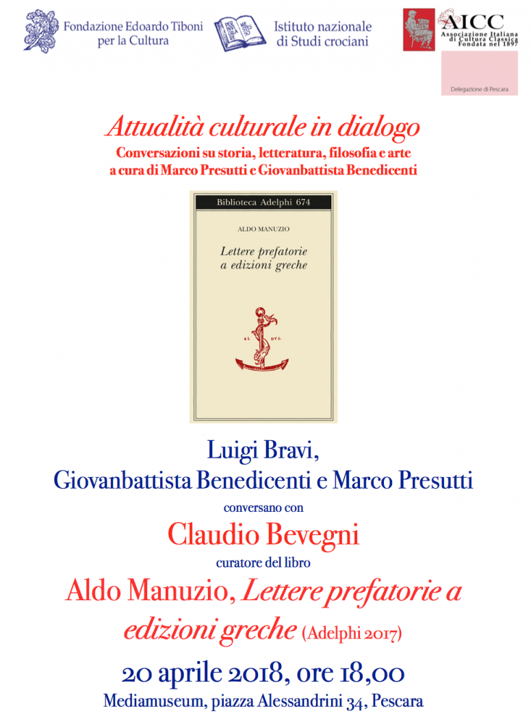 L’incontro, con ingresso libero, avrà inizio alle ore 18 e rientra nel ciclo di conversazioni di Attualità culturale in dialogo (terza annualità). Luigi Bravi, docente di Teatro e drammaturgia antica all’Università di Chieti-Pescara , Giovanbattista Benedicenti, professore associato di Filologia classica all’Università di Genova e Marco Presutti, docente e coordinatore dell’iniziativa, converseranno con Claudio Bevegni, curatore dell’edizione della Lettere prefatorie a edizioni greche di Aldo Manuzio (Adelphi 2017).