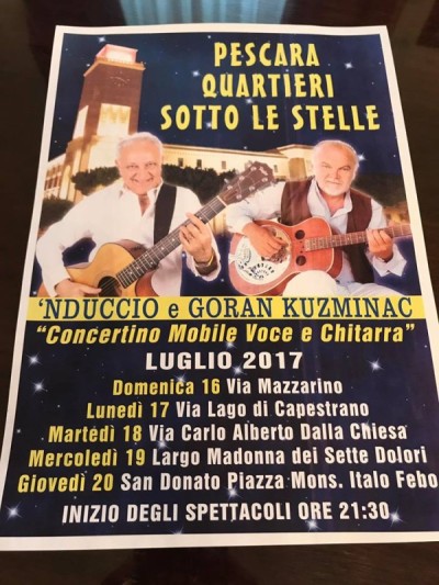 Cominceranno domenica 16 luglio a Pescara ” Quartieri sotto le stelle”, cinque concerti, patrocinati dal Comune. Protagonisti N’duccio e Goran Kuzminac.