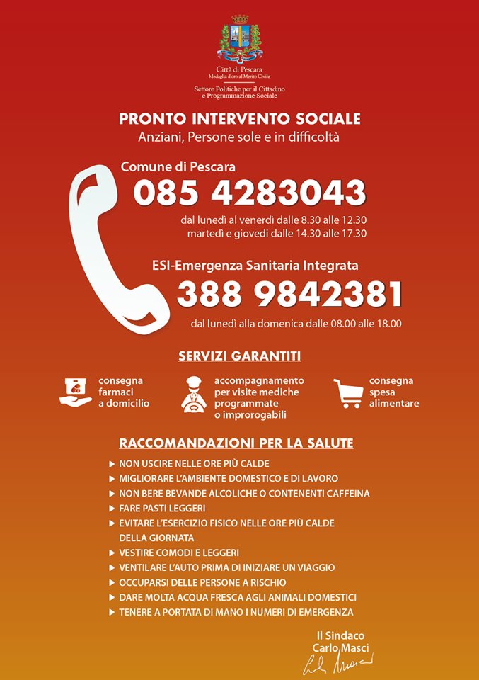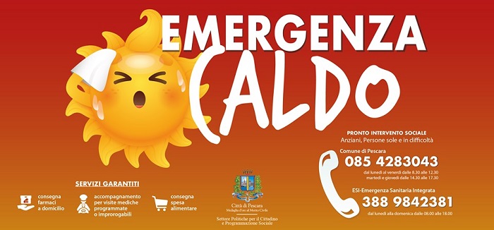 “A seguito dell’ondata di caldo che ha colpito la nostra città, e della conseguente situazione di emergenza in cui i cittadini più fragili possono trovarsi, il Comune di Pescara, nell’ambito del Pronto Intervento Sociale, ha provveduto ad attivare un servizio volto ad intervenire per la consegna dei farmaci a domicilio, la consegna della spesa alimentare e l’accompagnamento per visite mediche programmate o improrogabili, per gli anziani e le persone sole in difficoltà”.