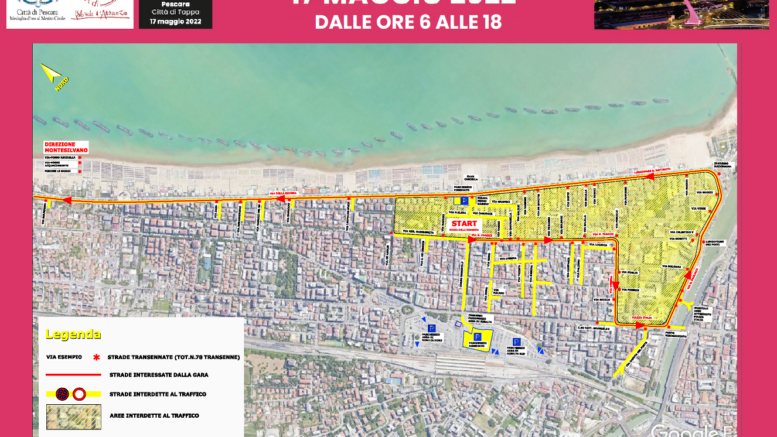 Per tutta la giornata di martedì 17 maggio l’isola chiusa alle auto verrà ulteriormente allargata, con il divieto di sosta e di fermata con rimozione forzata, dalle ore 5 fino alle ore 14 su tutto il percorso di gara: Via Nicola Fabrizi; Via Venezia; Corso Vittorio Emanuele, nel tratto compreso tra Via Venezia e Piazza Duca d’Aosta; Piazza Duca d’Aosta fino all’incrocio con Via Paolucci; Via Paolucci; Lungomare Matteotti; Viale della Riviera nord, da Piazza 1° maggio fino al confine con il Comune di Montesilvano dove poi proseguirà la corsa.