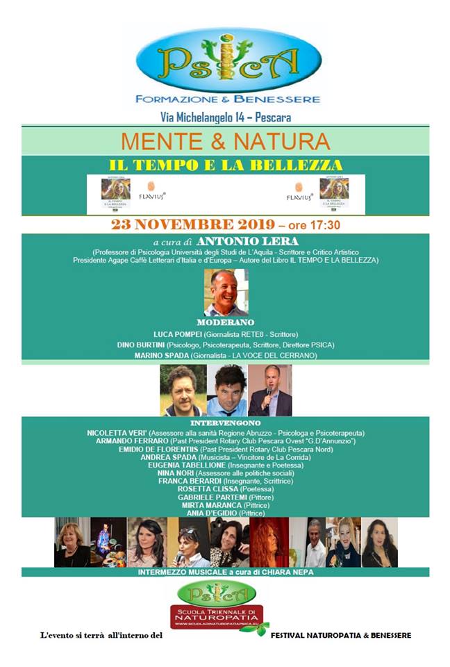 Il libro di poesie “Il Tempo e la Bellezza”, ultima fatica letteraria del professore di psicologia Antonio Lera, scrittore e critico artistico presidente Agape Caffè Letterari d’Italia e d’Europa, sarà presentato domani pomeriggio alle 17.30 presso la sede di “Mente & Natura” a Pescara in Via Michelangelo 14. Si tratta di un appuntamento che va al di là della semplice presentazione e vuole essere un momento di confronto con esperienze legate alla psicologia e alla natura. Interverranno, oltre all’autore, Dino Burtini, psicologo, psicoterapeuta, scrittore e direttore di “Psica”, musicisti, poeti e pittori a testimoniare l’importanza della riconciliazione con la natura come elemento di benessere. L’evento, infatti, è all’interno della rassegna del Festival Naturopatia & Benessere. Previsto un saluto da parte dell’assessore regionale della sanità Nicoletta Verì, e gli interventi di Armando Ferraro (Past President Rotary Club Pescara Ovest “G.d’Annunzio); Emidio De Florentiis (Past President Rotary Club Pescara Nord), oltre ai musicisti Andrea Spada e Chiara Nepa, alla scrittrice Franca Berardi, ai poeti Eugenia Tabellione e Rosetta Clissa e ai pittori Gabriele Partemi, Mirta Maranca e Ania D’Egidio, oltre all’assessore alle politiche sociali del Comune di Montorio Nina Nori.