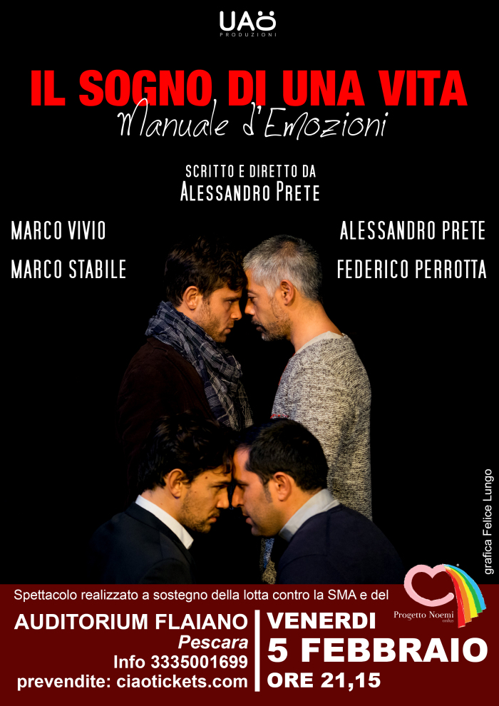 Pescara: il sogno di una vita , manuale d’Emozioni è il nuovo spettacolo scritto e diretto ed interpretato da Alessandro Prete di scena il 5 febbraio all’auditorium Flaiano. Sul palco con Alessandro Prete che abbiamo visto nel film “ Romanzo criminale” e nella serie televisiva “ Squadra antimafia 5” ci saranno gli attori Marco Stabile che ha recitato nei musical “Dirty Dancing “ e “ Grease “, Marco Vivio nelle serie televisive “Don Matteo 4” e “Un Medico In Famiglia” e Federico Perrotta in “Vieni Avanti Cretino” e “ Io Sono Abruzzo”. Il ricavato della serata sarà devoluto alla Onlus “Progetto Noemi” di cui è presidente Andrea Sciarretta, papà della piccola Noemi, la bimba di Guardiagrele affetta da Sma 1.