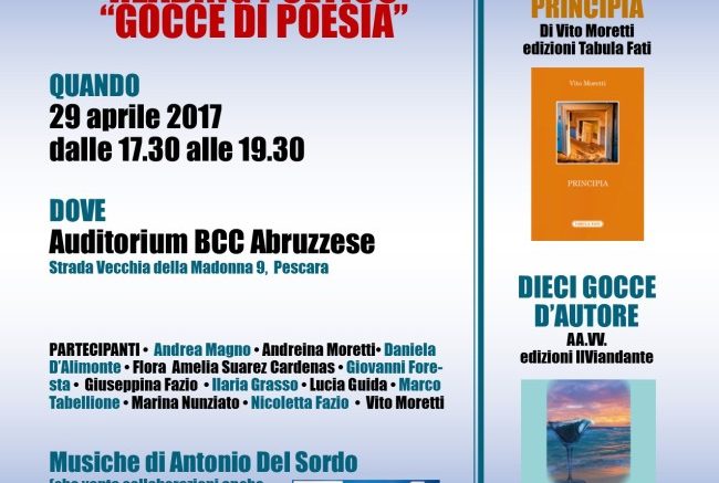 Poesia e musica dal vivo. Questi gli ingredienti principali del reading previsto per sabato 29 aprile – dalle 17:30 alle 19:30 – all’auditorium della BCC Abruzzese di Pescara (strada Vecchia della Madonna 9 – zona colli) con ingresso gratuito.