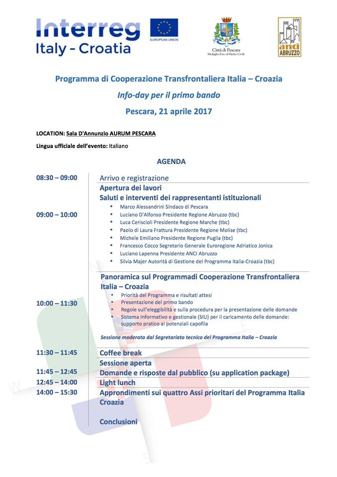 Importante appuntamento di cooperazione transfrontaliera domani, venerdì 21 aprile, all’Aurum di Pescara. A partire dalle ore 9, negli spazi dello Europe Direct, si incontreranno i rappresentanti istituzionali delle regioni italiani e croate coinvolte nella diffusione del programma di Cooperazione transfrontaliera Interreg Cbc. All’evento prenderanno parte, oltre al sindaco di Pescara Marco Alessandrini e al presidente della giunta regionale Luciano D’Alfonso, anche i presidenti delle Regioni Marche (Ceirscioli), Molise (Frattura) e Puglia (Emiliano), oltre al presidente dell’Anci Abruzzo Luciano Lapenna e ad altre figure importanti del settore.