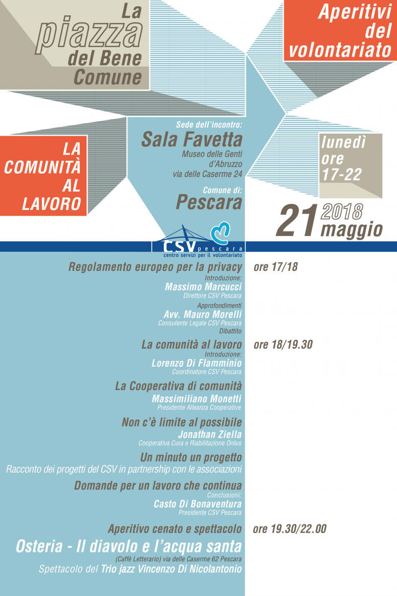 Gli organizzatori spiegano in una nota che “Le idee concretizzate sono state tante e diversificate, come lo sono le esigenze della comunità: dai racconti per rafforzare il rapporto tra giovani e anziani, al musical “La Bella e la Bestia” interpretato dai ragazzi con disabilità, a murales e video per far conoscere e comprendere le periferie più difficili e molte altre. Previste le testimonianze di Massimiliano Monetti, presidente Alleanza delle Cooperative Abruzzo, sul fenomeno delle cooperative di comunità, e di Jonathan Ziella, della Cooperativa Cura e Riabilitazione Onlus, con l’intervento “Non c’è limite al possibile” su un’esperienza davvero insolita di volontariato. Al termine del pomeriggio aperitivo cenato con il Trio Jazz Vincenzo Di Nicolantonio, presso l’Osteria – Il diavolo e l’acqua santa (Caffè letterario), sempre in via delle Caserme. L’evento si inserisce nell’inedito momento di riflessione all’interno della Piazza del Bene Comune, il lavoro che il CSV di Pescara ha aperto nel 2017 e che conduce con le associazioni della provincia. Già dalla mattinata infatti, ci saranno i momenti conclusivi del progetto “Io, tu… volontari!” che ormai da 18 anni coinvolge centinaia di studenti della provincia in esperienze di volontariato”.