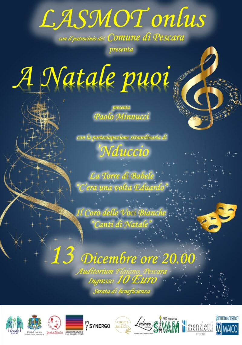 Serata di solidarietà con “A Natale puoi” all’Auditorium Flaiano di Pescara il 13 dicembre. Un evento organizzato dalla Lasmot Onlus, la Lega Abruzzese a Sostegno dei Malati Oncologici Toracici, con il patrocinio del Comune