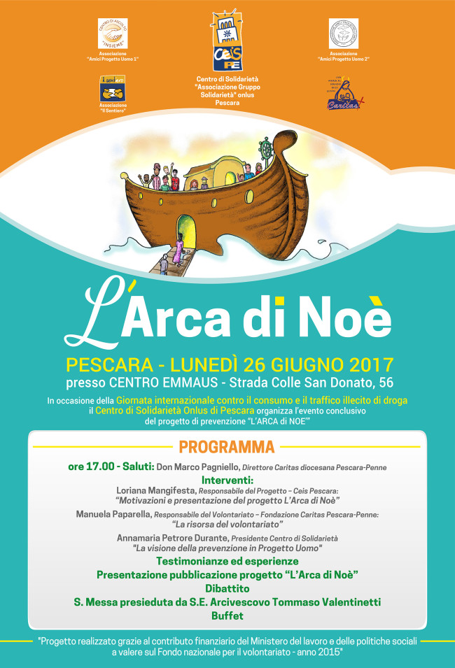 In occasione della Giornata Internazionale contro l’abuso e il traffico illecito di droga, indetta nel 1987 dalle Nazioni Unite, il Centro di Solidarietà Onlus di Pescara organizza un incontro presso il Centro Emmaus a partire dalle ore 17. Celebrare questa giornata significa ribadire l’impegno e il sostegno per chi si trova in difficoltà, per trasmettere un messaggio di speranza, per ricordare che la persona, con la sua dignità, è più importante di qualsiasi altra cosa. Per questo è necessario mettere al centro la cura e la prevenzione. Ed è per questo che nell’evento di lunedì 26 giugno il Ceis rifletterà proprio sugli interventi di prevenzione, presentando il progetto “L’Arca di Noè”, rivolto a genitori ed educatori – e che ha previsto anche una parte di formazione per volontari – realizzato insieme alla Fondazione Caritas dell’Arcidiocesi di Pescara-Penne, all’Associazione Amici del Progetto Uomo di Roseto, all’Associazione Il Sentiero Onlus di Silvi e all’Associazione Amici del Progetto Uomo 2 di S. Egidio alla Vibrata, grazie al contributo del Ministero del lavoro e delle politiche sociali (L. 266/91 anno 2015). L’incontro prevede interventi, testimonianze e dibattito e si concluderà con una Santa Messa celebrata dall’Arcivescovo Tommaso Valentinetti.