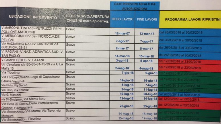 Pescara zona colli, dal 12 marzo al 23 marzo: Via Di Girolamo, via Passo della Portella, via Corno Grande, via la Camosciara, via Monte Luco, via Campo Felice, via Catani, via Strada Cavallaro e via Ugo La Malfa. Pescara zona Tiburtina, dal 12 marzo al 23 marzo: via Stradonetto, via Marta, via Tavo, via Metauro, Tiburtina, via Fortore, via Chienti, via Lago di Capestrano e via Salara Vecchia, via Gizio, via Sacco, via Tronto. Pescara zona stadio, dal 26 marzo al 30 marzo: via G. Marconi, via Tinozzi, via Petruzii, via Pepe, via Pollione, via Marruccini incrocio via dei Peligni, via Mazzarino, via Guelfi, via Fagiani, via Nazionale Adriatica sud, via San Paolo”.