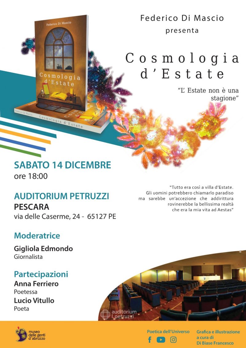 Sabato 14 dicembre al museo delle Genti d’Abruzzo, alle ore 18, sarà presentato il libro di Federico Di Mascio ” Cosmologia d’Estate”, seconda fatica letteraria del giovane scrittore abruzzese.