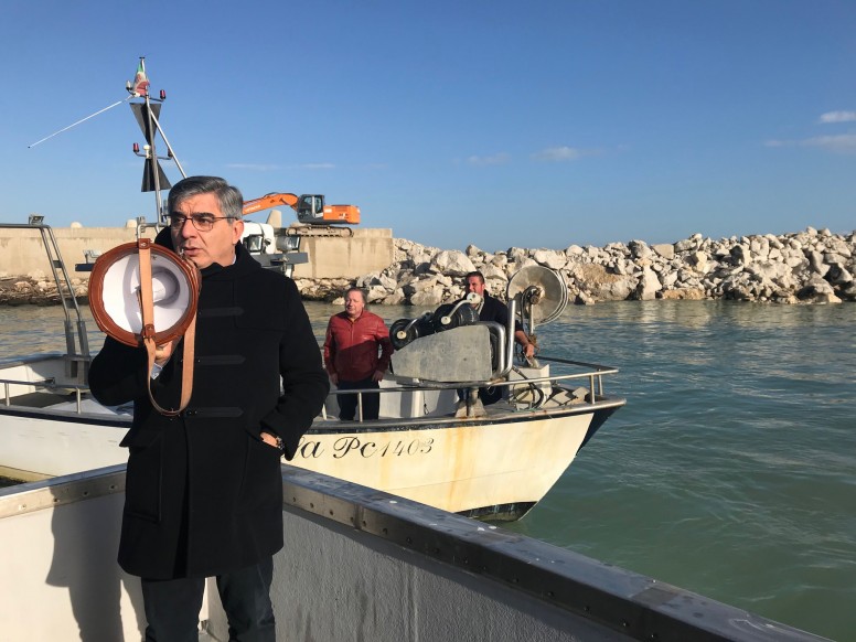 In una settimana già abbattuti 20 metri lineari in superficie, degli oltre 100 da demolire. Un lavoro complesso della Rcm Costruzioni su una struttura a cuneo che dai circa 7 metri di larghezza in cima si espande fino a circa 16 metri sul fondo. 3 milioni e mezzo il costo dei lavori che saranno completati entro l’estate. Per la prima volta le telecamere, quelle di Rete8, a pochi metri dal cantiere a bordo della vongolara Nonno Remo I° dell’armatore Claudio Lattanzio, insieme ad altri rappresentanti della stampa, della marineria e del presidente della Regione Luciano D’Alfonso che sottolineando l’importanza dell’opera ha parlato anche dei progetti futuri, dai 15 milioni già disponibili per la realizzazione dei moli guardiani fino ad altre iniziative a supporto del comparto pesca: