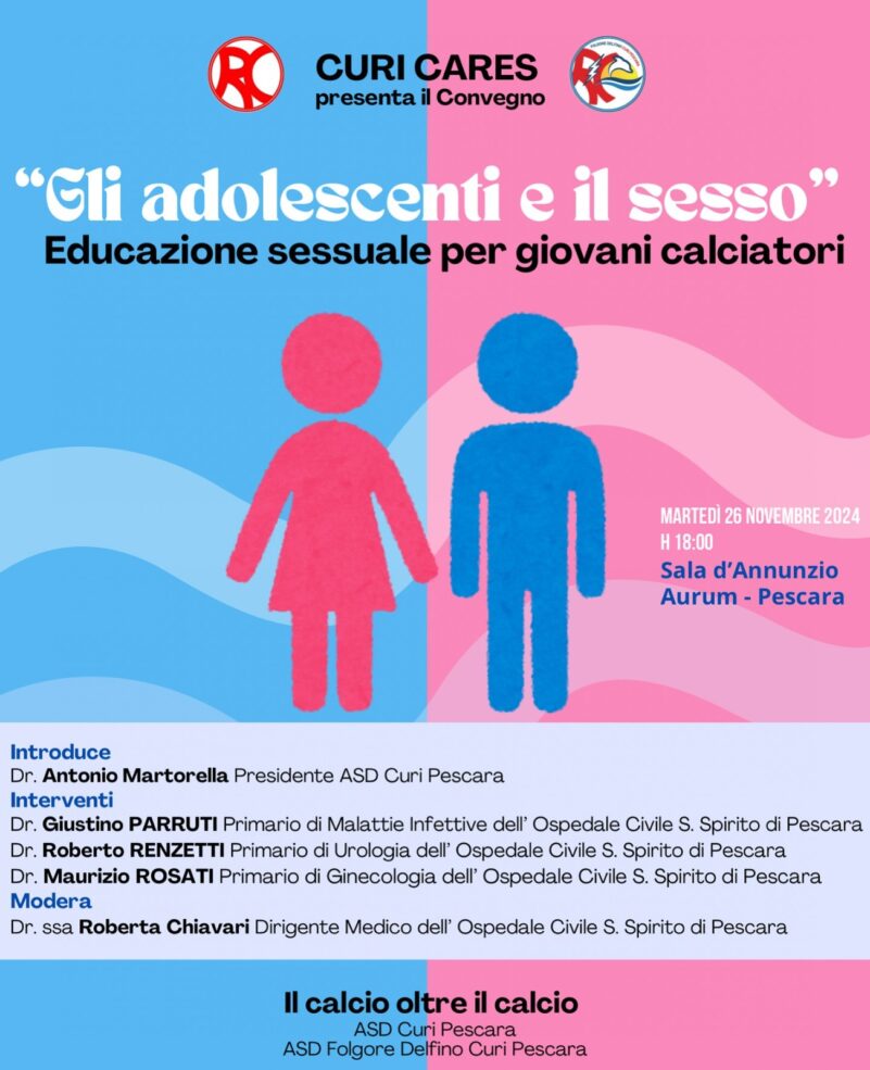 Il presidente della Curi, Antonio Martorella, spiega: “Tre primari riuniti per parlare ad una platea di centinaia di giovani calciatori di educazione sessuale. Un tema delicato, troppo spesso tabù, sia a scuola che in famiglia. E che la Curi Pescara, invece, vuole trattare in modo serio e scientifico, con dei luminari della medicina, per la crescita dei suoi giovanissimi tesserati. Un evento che assume i contorni di una prima storica non solo in città e in Abruzzo, ma probabilmente nell’intero panorama del calcio dilettantistico nazionale.