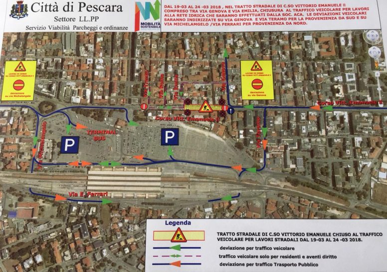 Da lunedi a Sabato Corso Vittorio Emanuele non sarà transitabile da via Emilia a via Genova per una grossa perdita di acqua che Aca deve riparare. Per chi viene da Nord consigliamo di percorrere via Michelangelo e via Ferrari o via Bassani- Pavone. Per chi viene da Sud Corso Vittorio è percorribile fino a via Teramo per gli autobus e fino a via Genova per le auto. In Via Emilia, via Trieste e via Genova le auto dei residenti troveranno la possibilità di svoltare verso nord. Entro sabato tutto dovrebbe rientrare alla normalità. Da martedi chiude invece via Lago di Scanno per lavori di ripristino della pavimentazione, nel tratto compreso tra Piazza Garibaldi e via Degli Aprutini. Riapre sabato.