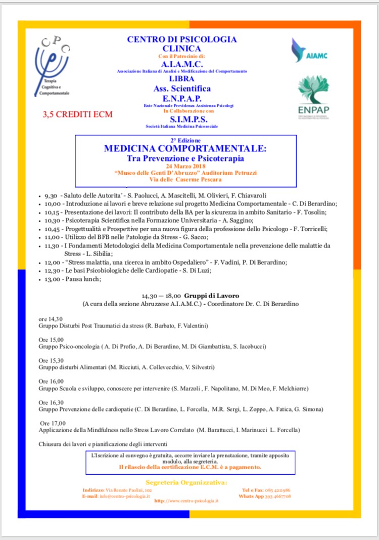 Il dottor Carlo Di Berardino, direttore del CPC, spiega che ” obiettivo del convegno e’ quello di riaffermare la necessità di attivare servizi e centri per il trattamento dei disturbi d’ansia da stress che, se trattati esclusivamente con psicofarmaci, con il tempo tendono a cronicizzarsi determinando patologie psicosomatiche ben più gravi. Secondo l’OMS il 65% delle patologie ha una eziologia psichica. Questo lavoro, quindi, può essere affrontato avvalendosi di un approccio scientifico come quello proposto dalla sezione abruzzese dell’AIAMC, forte di ben oltre 100 terapeuti cognitivo comportamentale dislocati nel territorio, in grado di garantire terapie con risultati efficaci, in tempi brevi e con notevole risparmio di soldi. Abbiamo dimostrato che e’ possibile intervenire efficacemente su queste problematiche, con una recente sperimentazione effettuata presso il reparto di cardiologia dell’ospedale civile di Pescara. Dove grazie alla collaborazione della dottoressa Iannetti, del dipartimento di prevenzione della AUSL di Pescara, e’ stato possibile su un campione di circa 30 pazienti affetti da ipertensione arteriosa con un programma di 8 incontri basati su tecniche di autocontrollo, di ottenere un miglioramento generale dell’ansia e un livello contenuto di attivazione nervosa e tempi di recupero dallo stress più brevi . Ma il dato più interessante e’ stato che la maggior parte dei pazienti, ha ridotto l’uso dei farmaci e delle visite di controllo con notevole risparmio della spesa calcolata su quella media pro-capite di 181,25 euro riducendola del 50,85% pari a circa 74,4 euro che moltiplicate per le centinaia di migliaia di persone diventa un cifra considerevole. Questi dati hanno immediatamente destato interesse clinico da parte dell’ENPAP che ha proposto un finanziamento alla Regione Abruzzo per ampliare il progetto ad una campione più esteso, ma nonostante queste premesse il progetto non ha ancora ricevuto garanzie per la sua realizzazione. Per questa ragione riteniamo sia arrivato il momento di risposte piu’ chiare da parte delle autorità’ sanitarie Abruzzesi. Quindi e’ nostra l’intenzione realizzare dei progetti di intervento preventivi per intervenire in aree dove e’ più presente i disagio e ridurre il danno oltre che curarlo . Per questo motivo durante il convegno gruppi di lavoro istituti dal coordinamento della sezione AIAMC d’abruzzo presenteranno una serie di progetti per intervenire nei diversi settori in cui e’ possibile con poco ottenere risultati in aree a rischio dove e’ più presente il disagio come : i disturbi alimentari, quelli post traumatici , ossessivo compulsivi , le new Addiction, e su tutta una serie di problemi che riguardano la scuola e il mondo giovanile . Molti dei quali non hanno ancora ricevuto l’attenzione da parte del SSN che non ha ancora quantificato il potenziale patogeno di certe dipendenze tecnologiche le quali possono determinare conseguenze Psicopatologiche gravi sulla sfera affettiva e sulla personalità”.