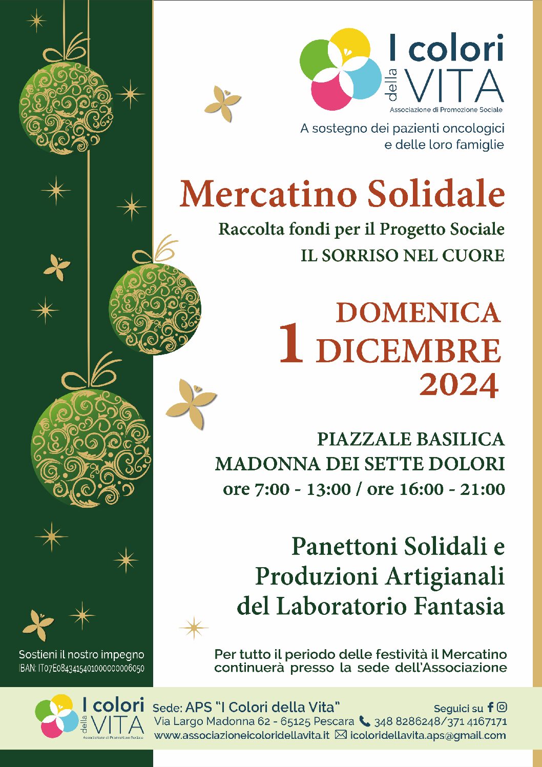 A Pescara è attivo il mercatino solidale per raccogliere fondi per il progetto sociale ‘Il sorriso nel cuore’ promosso dall’Associazione ‘I colori della vita’ a sostegno dei pazienti oncologici e delle loro famiglie