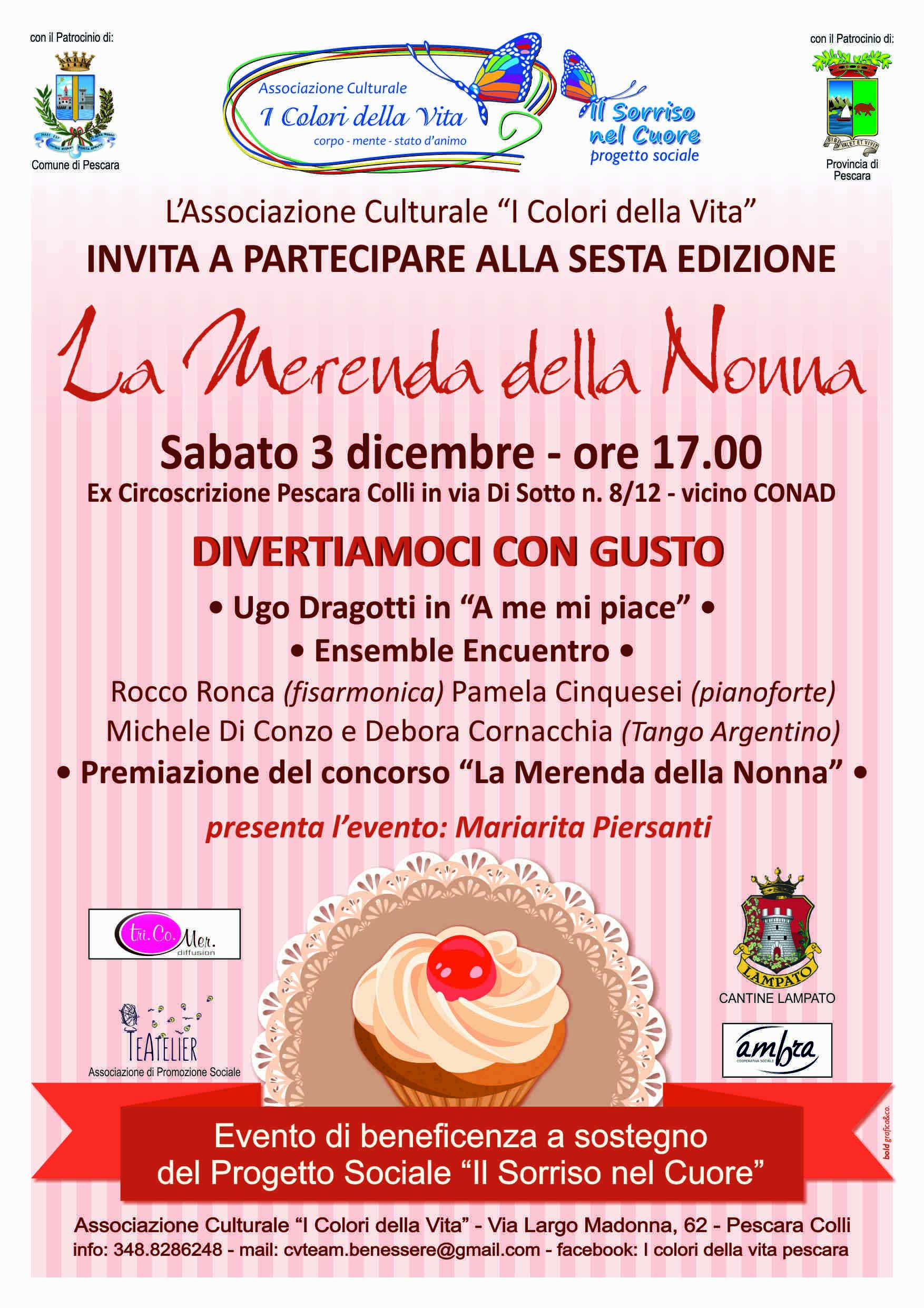 Oggi pomeriggio ,alle ore 17 , nella sede della ex circoscrizione di Pescara Colli, in via Di Sotto 8/12, si terrà la sesta edizione de “La merenda della nonna” organizzata dall’associazione culturale “ I Colori della Vita”, di cui è presidente Giovina Zulli. Si tratta di un concorso culinario pensato per sensibilizzare grandi e piccini, giovani e meno giovani alla riscoperta e alla condivisione delle tradizioni culinarie e delle sane abitudini alimentari. L’evento verrà presentato dalla giornalista Mariarita Piersanti.