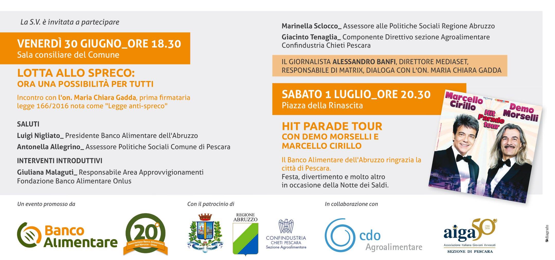 Cosimo Trevisani del Banco Alimentare ha affermato “Dopo vent’anni di lavoro del Banco Alimentare abbiamo organizzato questa iniziativa anche per un senso di gratitudine nei confronti dei pescaresi . Riflettiamo sullo spreco, lo facciamo già da venerdì con un convegno ospitato dalla Sala Consiliare del Comune alle ore18.30, a cui parteciperanno tanti interpreti di una lotta allo spreco alimentare che ci vede in prima linea da sempre. E’ una importante opportunità di riflessione, ricordo infatti come il Banco aiuta 47.000 poveri in Abruzzo e Molise ogni anno. Per festeggiare questo importante anniversario animeremo piazza della Rinascita con lo spettacolo di Demo Morselli che renderà più movimentata la Notte dei Saldi, insieme a Marcello Cirillo”.