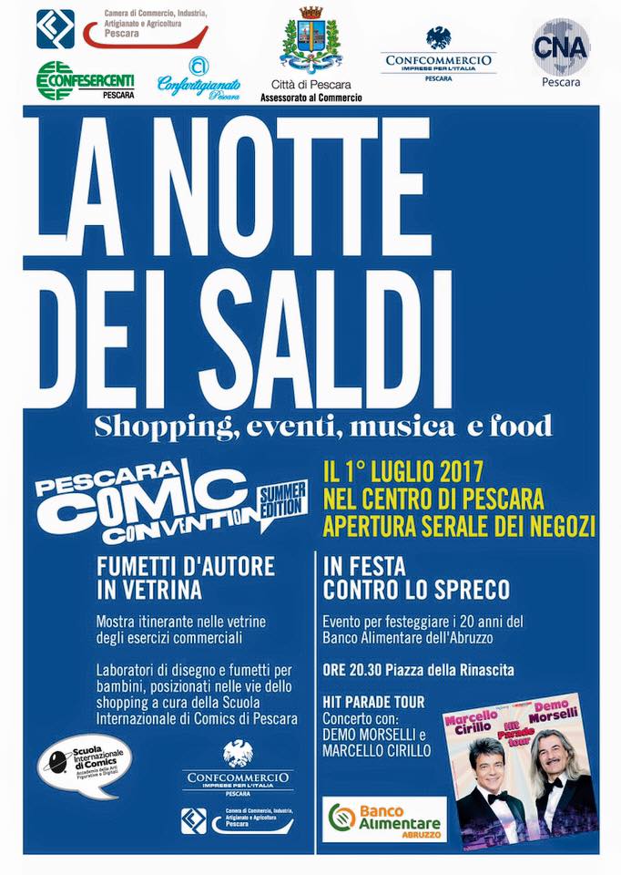Marco di Pietro, con Simone D’Angelo ed Endas Abruzzo motore di Pescara Comic, hanno aggiunto che “Notte dei Saldi e dei fumetti con la “Pescara Comic Convention”, sabato 1 e domenica 2 luglio. Ci è sembrato giusto unire le forze ed abbiamo organizzato iniziative ad hoc: mostre itineranti che si potranno vedere nelle vetrine degli esercenti del centro, 4 laboratori di disegno per bambini e tanti eventi che ufficializzeremo presto”.