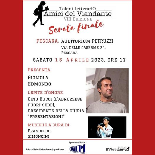 Tradizione di “Amici del Viandante” è quella di occuparsi non solo di letteratura, ma anche di dare spazio alla musica. Ogni anno sul palco si sono alternati musicisti, cantautori e interpreti. Quest’anno il protagonista è stato il cantante Francesco Simoncini, 17 anni, originario di Serra San Quirico, comune della provincia di Ancona. Ha vinto la finale regionale nelle Marche a soli 15 anni del Cantagiro e si è classificato al secondo posto nella finalissima nazionale della kermesse. Frequenta il Liceo Classico “Vittorio Emanuele II” di Jesi dove studia canto alla Scuola Musicale Pergolesi da quando aveva sei anni e pianoforte da quando ne aveva sette. Sul palco è salito anche il presidente della giuria Gino Bucci, alias l’Abruzzese fuori sede, che sta spopolando in Abruzzo, ma non solo, con un libro bellissimo dal titolo “Rime toscibili”.