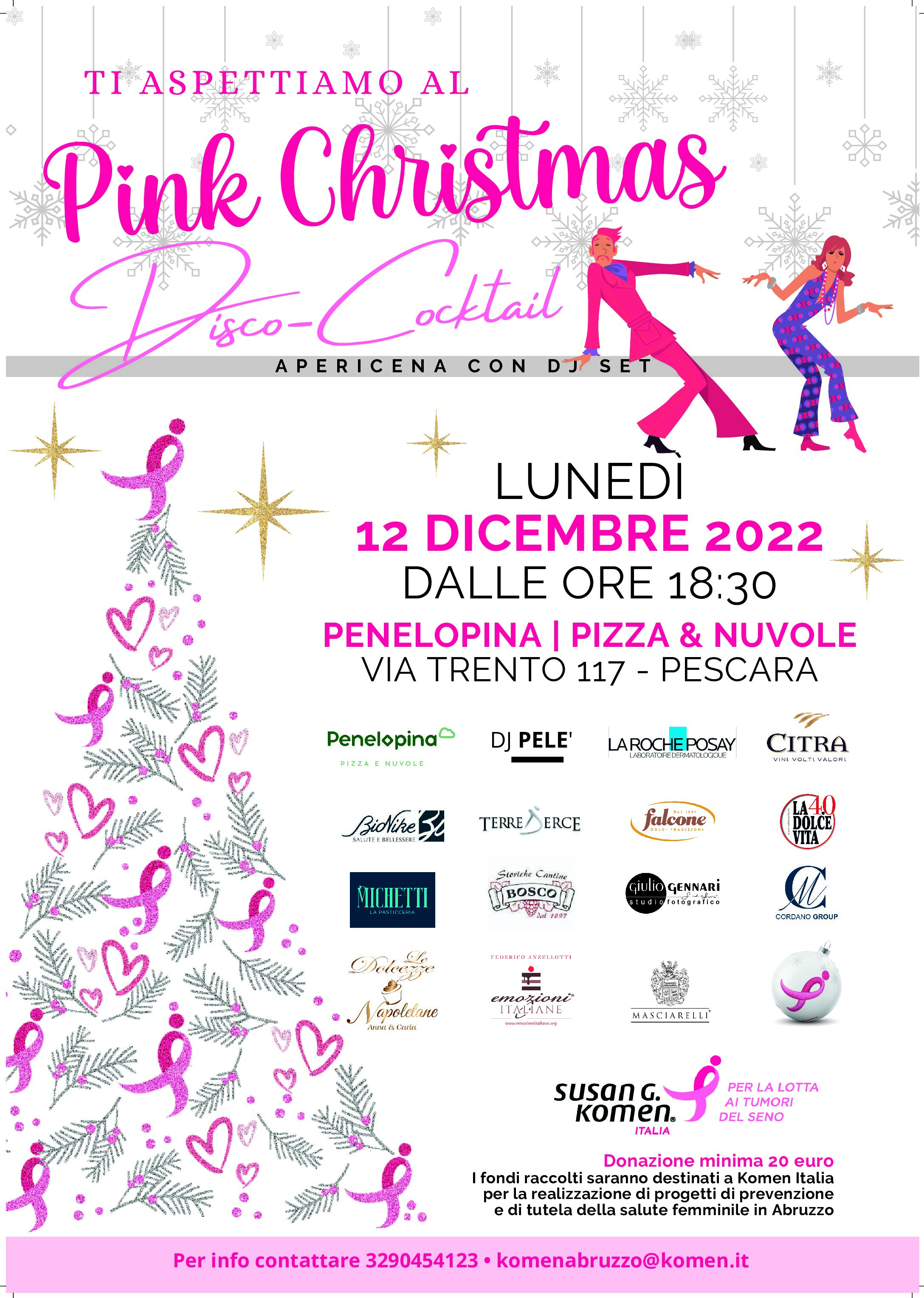 “Pink Christmas Disco-Cocktail” è il party di beneficenza organizzato dalle Ladies del Comitato Abruzzo della Komen Italia . L’appuntamento è per lunedì 12 dicembre, a partire dalle ore 18:30, da Penelopina in Via Trento 117 a Pescara.