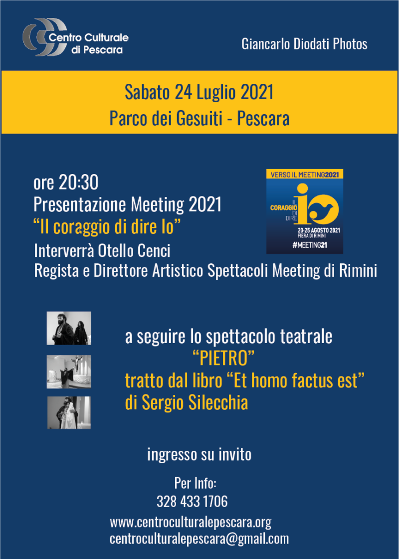 Il programma della serata organizzata dal Centro Culturale di Pescara, che inizia alle 20:30, prevede la presentazione del Meeting 2021 e la partecipazione di Otello Cenci, regista e direttore artistico Spettacoli Meeting di Rimini, e a seguire, lo spettacolo teatrale “Pietro”, tratto dal libro “Et homo factus est” di Sergio Silecchia e con la regia di Stefano Giannascoli.