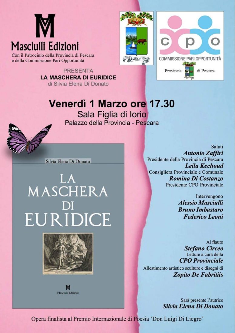 Questo pomeriggio nella sala della Provincia di Pescara la presentazione del libro di Silvia Elena Di Donato “La maschera di Euridice”.