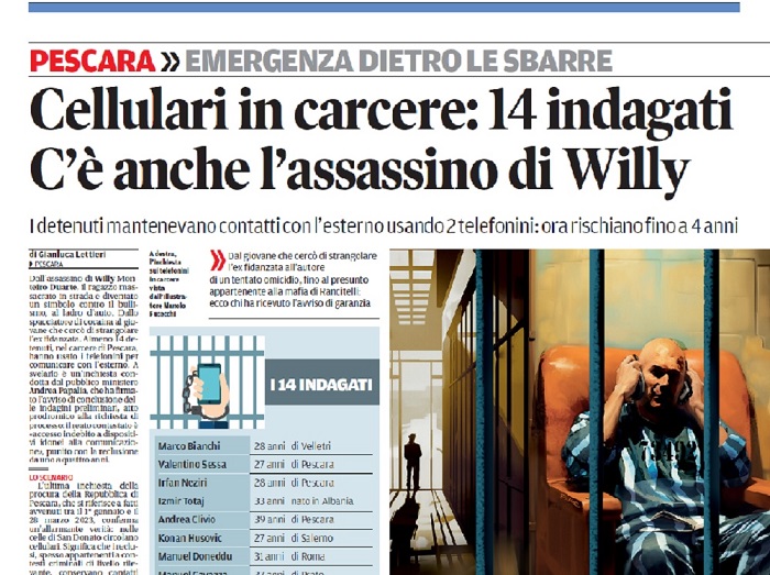 Dal giovane che cercò di strangolare l’ex fidanzata all’autore di un tentato omicidio, fino al presunto appartenente alla mafia di Rancitelli, solo alcuni dei 14 che hanno ricevuto l’avviso di garanzia. I detenuti mantenevano contatti con l’esterno con due telefonini, ora rischiano fino a 4 anni. La vicenda raccontata sulle pagine de il Centro da Gianluca Lettieri. L’ultima inchiesta della procura della Repubblica di Pescara, che si riferisce a fatti avvenuti tra il 1° gennaio e il 28 marzo 2023, conferma un’allarmante verità: nelle celle di San Donato circolano cellulari.