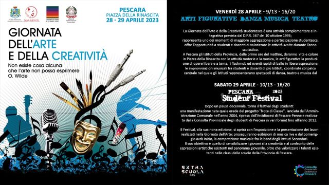 Organizzata dalla Consulta provinciale studentesca di Pescara torna in piazza la “Giornata dell’Arte e della Creatività”. E domani il bis con il Pescara Student Festival