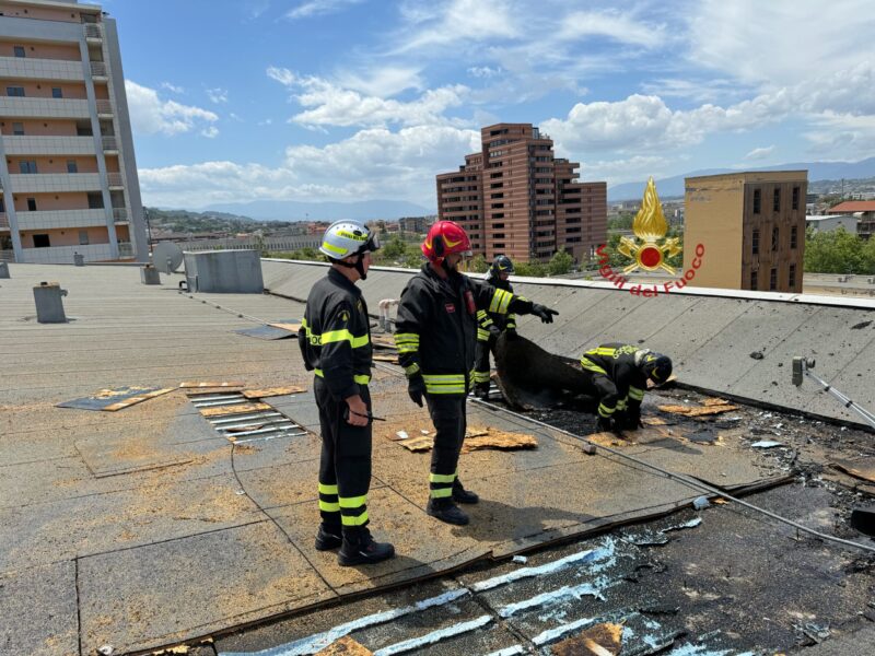 La combustione, scaturitasi per cause in corso di accertamento, ha interessato i materiali costituenti il rivestimento di coibentazione e impermeabilizzazione posto a protezione della sottostante struttura portante del tetto.