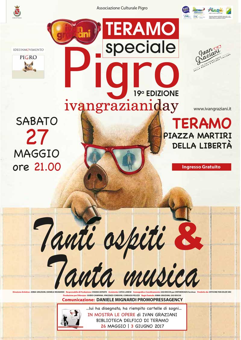 Gli organizzatori hanno annunciato che “Presentati dal conduttore Rai Paolo Notari, si esibiranno, tra gli altri, Mario Lavezzi, Vittorio De Scalzi, Bungaro, l’artista americana Eliees Rose (che ha tradotto in inglese ed interpretato alcune canzoni del cantautore) e, come da tradizione, non mancheranno i due figli di Ivan: Tommy e Filippo Graziani. Batterista di successo, Tommy guiderà la band del “Pigro Tour” (omaggio ufficiale ad Ivan, composta dai musicisti che hanno suonato e collaborato con l’artista scomparso) mentre Filippo Graziani – cantautore Targa Tenco, pronto a girare l’Italia per promuovere il suo prossimo album, dal titolo “Sala giochi” (Farn Music/Universal), in uscita tra pochi giorni, il 16 giugno – canterà parte del repertorio del papà e presenterà in anteprima alcune canzoni del nuovo progetto. All’evento prenderanno parte tanti addetti ai lavori, rappresentanti delle Istituzioni locali, amici di Ivan, e sarà dato spazio ad alcune delle più interessanti cover band del cantautore. Nel corso della serata verrà assegnato il Premio Imaie. Insomma, anche stavolta si attende il pubblico delle grandi occasioni.Per chi arriverà in auto, sono presenti parcheggi presso: Piazza San Francesco, Piazza Martiri Pennesi, Piazza Dante, Piazza Madonna delle Grazie”.