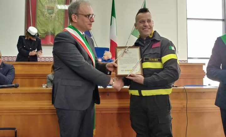 Nella notte dello scorso primo gennaio, l’auto, guidata dal giovane pinetese Mattia Di Nardo Di Maio, finiva fuori strada prendendo fuoco: il giovane rimase bloccato all’interno dell’auto per i gravi traumi subiti e per le portiere bloccate. Fortunatamente, Federico Pelusi, pinetese anche lui, in quel momento di passaggio proprio sul luogo dell’incidente, libero dal servizio, si fermava e, senza alcuna esitazione, sfidava la situazione di grave pericolo, rompeva il lunotto posteriore dell’auto, si introduceva nell’abitacolo, mettendo in salvo Mattia. “Abbiamo ritenuto doveroso evidenziare l’encomiabile gesto di Federico Pelusi – ha spiegato il sindaco di Pineto Robert Verrocchio – dimostrazione di grande tempismo, coraggio ed impeccabile professionalità. Un gesto che conferma, semmai ce ne fosse bisogno, che i Vigili del Fuoco, come tutte le altre Forze dell’Ordine, sono i nostri eroi di tutti i giorni, sempre in prima fila, sempre pronti a dedicare la propria opera al servizio delle comunità. Abbiamo ritenuto altresì – ha concluso – segnalare, con una nota scritta inviata al Prefetto di Teramo, l’atto di eccezionale coraggio di Federico, affinché si valuti, nelle sedi opportune, la concessione di una onorificenza.” “Quella notte – ha raccontato Di Nardo Di Maio – ho davvero avuto paura di perdere la mia vita, secondo dopo secondo perdevo speranze. Ma improvvisamente è arrivato il mio eroe, Federico, e non ci sarà mai nessuna ricompensa, da parte mia per lui, che possa ricambiare ciò che ha fatto per me, mi ha salvato la vita. Mi hanno colpito le sue parole – conclude il giovane – quando è venuto a trovarmi in ospedale, mi disse che ad ogni costo mi avrebbe tirato fuori vivo da quella macchina. È stato un gesto davvero eccezionale.”