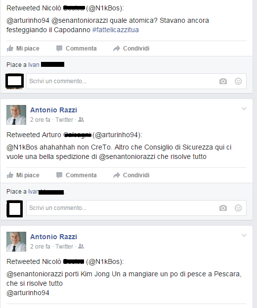 “Razzi, pensaci tu”, “Senatore abbiamo bisogno di Lei”, “L’equilibrio mondiale passa per le Sue acclarate doti diplomatiche”, “Quale atomica? Stavano ancora festeggiando il Capodanno”, “Senatore Razzi porti Kim Jong Un a mangiare un po di pesce a Pescara, che si risolve tutto”, “Alla bombe preferiamo Razzi”, e via dicendo. Che le sorti del pianeta siano nella mani del senatore Razzi?… Così si esorcizza la preoccupazione sulle notizia che ha già fatto il giro del mondo. “Ma la notizia non è questa – scherza qualcuno – la notizia sarà quando Kim Jong risponderà davvero a Razzi”.