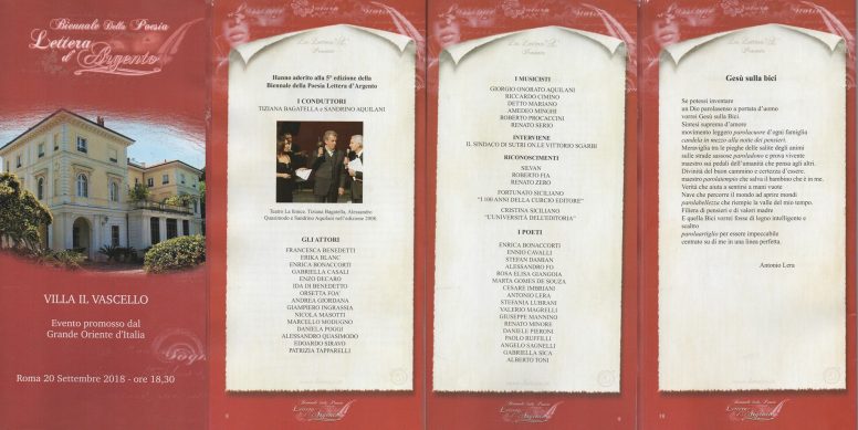 Il poeta abruzzese Antonio Lera, Presidente dei Caffè Letterari d’Italia e d’Europa e del Rotary Club Teramo Est – Distretto 2090, al suo Nono Libro Edito di Poesia “Il Tempo e la bellezza” è stato ieri tra gli illustri ospiti della Biennale della poesia “Lettera d’argento” a Villa “Il Vascello” a Roma.