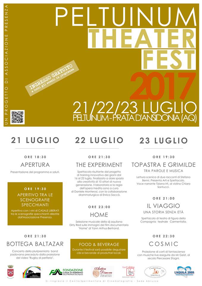 Va in archivio questa sera la seconda edizione del “Peltuinum Theater Fest” e registra ancora un grande successo per la capacità degli organizzatori di proporre un felice connubio tra le suggestive rovine di Peltuinum ed il teatro di qualità. Tre gli appuntamenti in programma per oggi: si parte alle 19.30 con “Topastra e Grimilde”, lettura scenica di due racconti di Stefano Benni, con la voce narrante di Tiziana Irti ed il violino di Chiara Santucci. Alle 21.00 “Il Viaggio”, una storia senza età con la compagnia teatrale “Carmentalia”. Alle 22.30 gran finale con “Cosmic”, proiezione di corti di fantascenza, in contrasto tra le antichità di “Peltuinum”, con musiche live di Mr Geist, al secolo Piercesare Stagni.