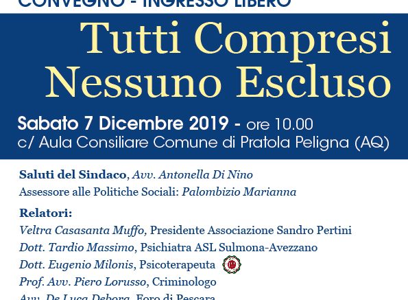 ”Tutti compresi nessuno escluso” è il titolo del convegno che si terrà domani, 7 dicembre, alle ore 10, in municipio a Pratola Peligna.