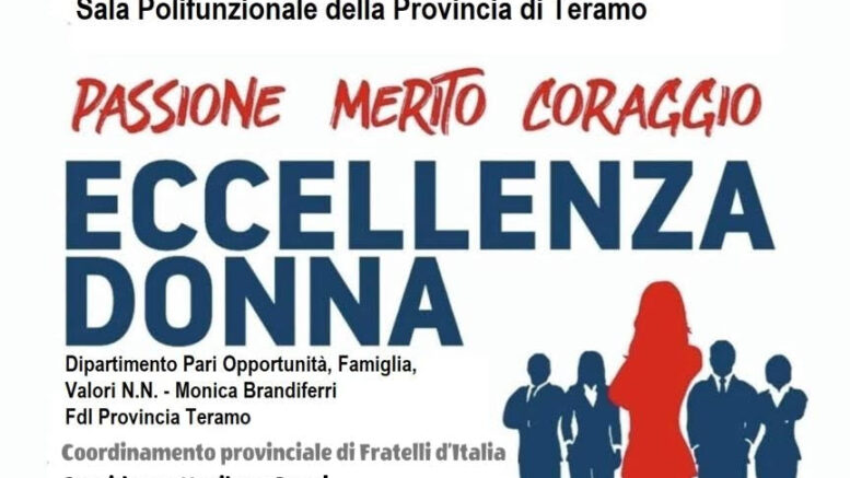 Gli organizzatori ricordano che <L’iniziativa si pone l’obiettivo di porre l’attenzione sulle eccellenze femminili e sul loro contributo fornito nella difesa dei valori fondamentali e, in quest’ottica, verrà conferito un riconoscimento a tre donne della Provincia di Teramo, Alessandra Gasparroni, Suor Pina Martella e Rosanna Monaco, che si sono distinte per passione, merito e coraggio nel campo culturale e della ricerca etnoantropologica, in quello sociale e della solidarietà verso gli ultimi, in quello professionale e della garanzia dei servizi essenziali. Fratelli d’Italia è da sempre in prima linea quando si tratta di rendere onore al valore e alle capacità delle donne e di conferire loro un giusto tributo per l’impegno, la dedizione, la professionalità e l’abnegazione che hanno dimostrato in questo periodo particolarmente difficile, in cui non hanno mai smesso di lavorare, fornendo un servizio fondamentale per l’intera comunità>.