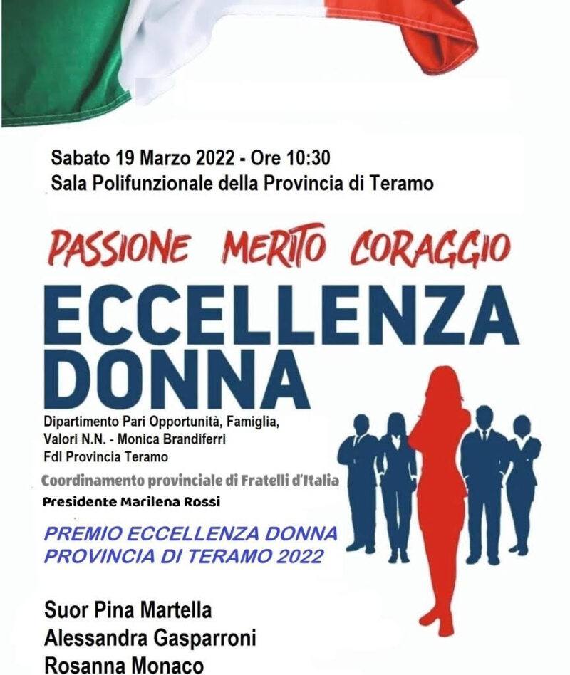 Gli organizzatori ricordano che <L’iniziativa si pone l’obiettivo di porre l’attenzione sulle eccellenze femminili e sul loro contributo fornito nella difesa dei valori fondamentali e, in quest’ottica, verrà conferito un riconoscimento a tre donne della Provincia di Teramo, Alessandra Gasparroni, Suor Pina Martella e Rosanna Monaco, che si sono distinte per passione, merito e coraggio nel campo culturale e della ricerca etnoantropologica, in quello sociale e della solidarietà verso gli ultimi, in quello professionale e della garanzia dei servizi essenziali. Fratelli d’Italia è da sempre in prima linea quando si tratta di rendere onore al valore e alle capacità delle donne e di conferire loro un giusto tributo per l’impegno, la dedizione, la professionalità e l’abnegazione che hanno dimostrato in questo periodo particolarmente difficile, in cui non hanno mai smesso di lavorare, fornendo un servizio fondamentale per l’intera comunità>.