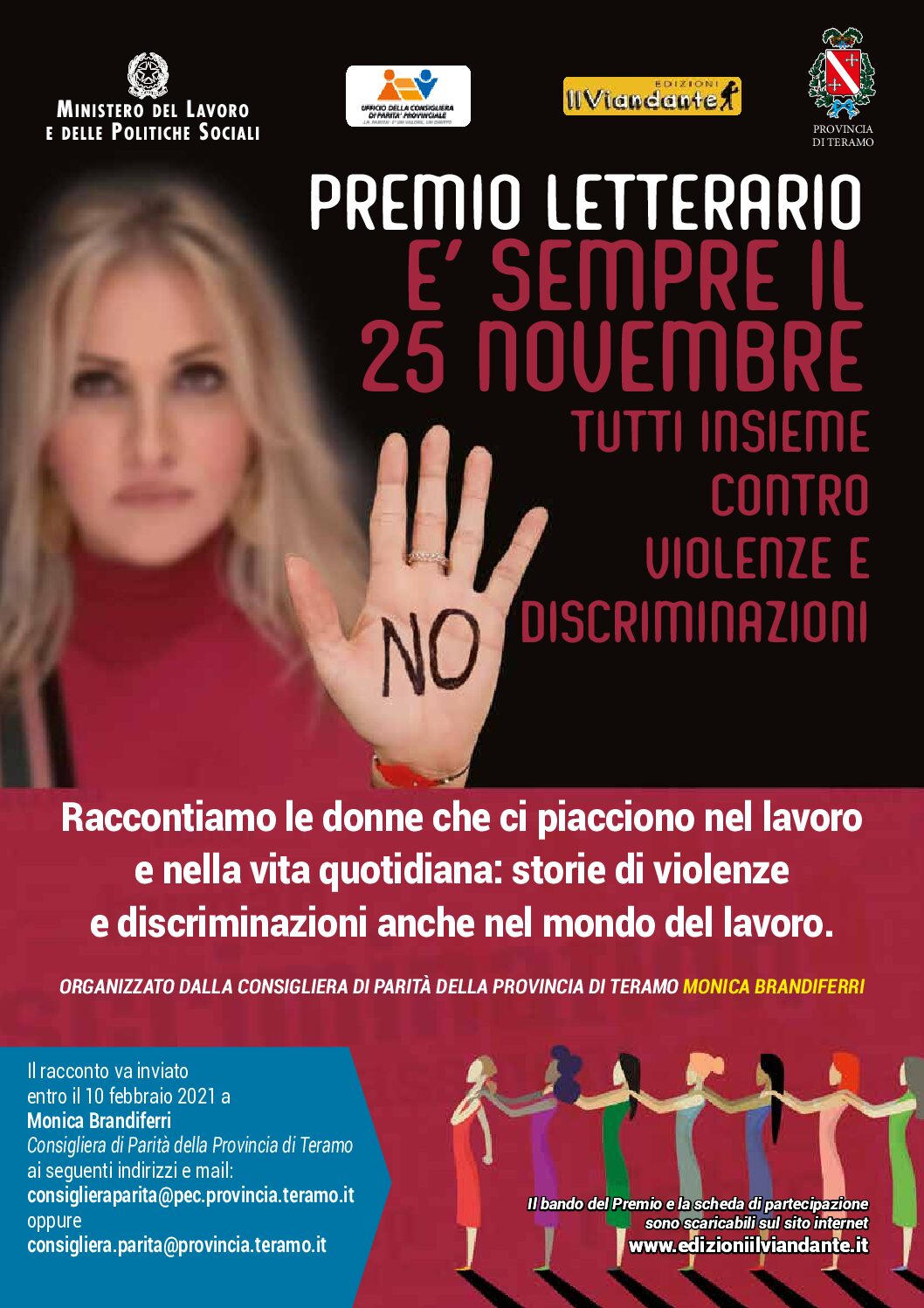 In occasione della Giornata Internazionale per l’eliminazione della violenza contro le donne, la consigliera di Parità della Provincia di Teramo Monica Brandiferri ha organizzato il Premio Letterario“E’ sempre il 25 novembre. Tutti insieme contro violenze e discriminazioni”.