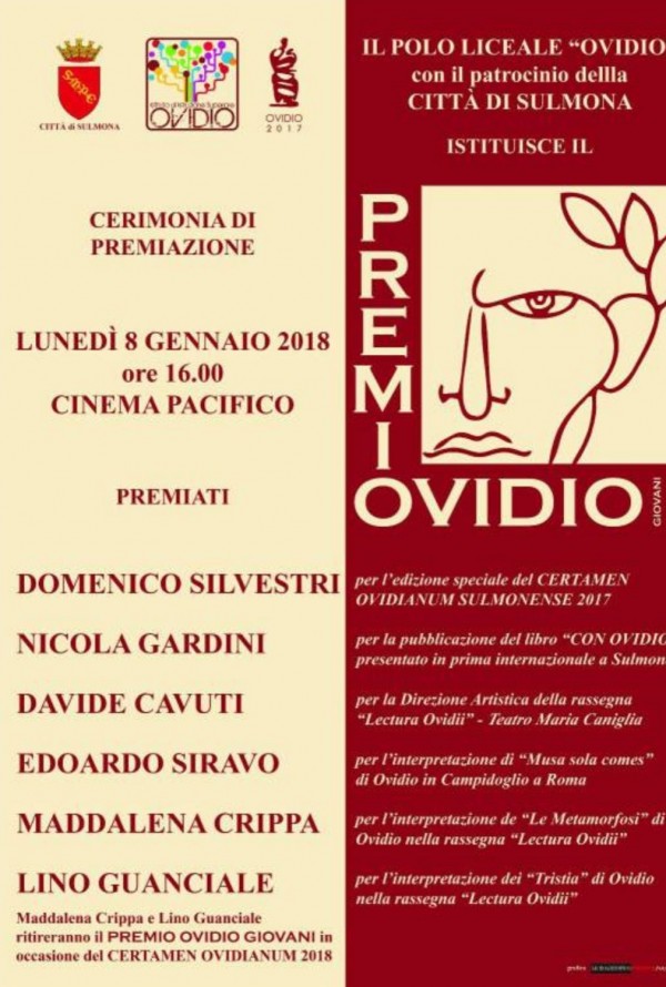 L’ 8 gennaio a Sulmona consegna dei riconoscimenti del Premio Ovidio Giovani. I vincitori sono Silvestri, Gardini, Cavuti , Crippa, Guanciale, Siravo.