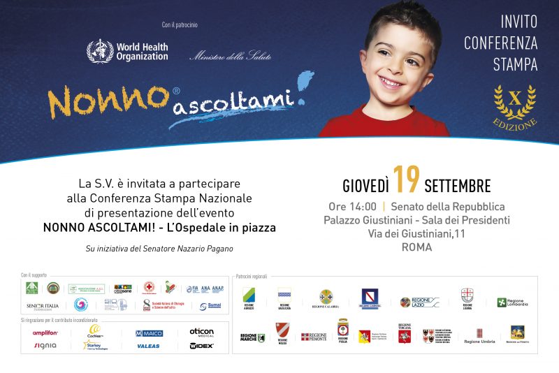 Al via giovedì 19 settembre, con la presentazione nazionale in Senato, della decima edizione di “Nonno Ascoltami! – L’Ospedale in Piazza”, manifestazione per la prevenzione dei disturbi uditivi realizzata con il patrocinio del Ministero della Salute e con il supporto dell’OMS.