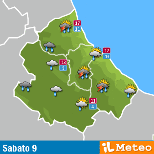 Piovaschi alternati e schiarite nel pescarese. I venti saranno prevalentemente moderati e soffieranno da EST con intensità di 10 km/h. Possibili raffiche fino a 15 km/h. Temperatura minima di 13 °C e massima di 17 °C. Zero termico a 2100 metri. Annuvolamenti con temporali nel pomeriggio e schiarite nel chietino. Vento da Levante con intensità di 7 km/h. Raffiche fino a 13 km/h. Temperature comprese tra 10°C e 18°C . Quota 0°C a 2100 metri. Giornata caratterizzata da piogge nell’aquilano. Vento da SW con intensità di 15 km/h. Raffiche fino a 21 km/h. Temperature: 5°C la minima e 13°C la massima. Zero termico a 1850 metri. Fenomeni temporaleschi sparsi a Teramo e provincia. Vento da ESE con intensità di 7 km/h. Raffiche fino a 8 km/h. Temperature: 11°C la minima e 17°C la massima. Zero termico a 2050 metri.