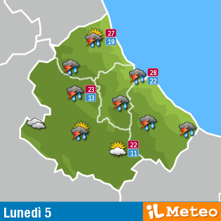 Nel pescarese giornata prevalentemente piovosa con fenomeni anche temporaleschi, min 21°C, max 28°C. In particolare avremo cielo in prevalenza coperto al mattino, deboli piogge o rovesci al pomeriggio, pioggia intermittente e schiarite alla sera. Durante la giornata di domani si registrerà una temperatura massima di 28°C alle ore 12, mentre la minima alle ore 23 sarà di 21°C, lo quota più bassa dello zero termico si attesterà a 3390m alle ore 23 e la quota neve minima sarà 2840m alle ore 20. I venti saranno al mattino deboli provenienti da Nord-Ovest con intensità di circa 8km/h, moderati da Nord-Nord-Est al pomeriggio con intensità di circa 16km/h, alla sera moderati provenienti da Nord-Nord-Ovest con intensità di circa 27km/h. La visibilità più ridotta si avrà alle ore 19 e sarà di 2950m. L’intensità solare più alta sarà alle ore 12 con un valore UV di 3.4, corrispondente a 609W/mq. Anche in Provincia di Chieti giornata prevalentemente piovosa con fenomeni anche temporaleschi, temperatura minima di 18°C e massima di 28°C. Entrando nel dettaglio, avremo cielo molto nuvoloso o coperto al mattino, deboli rovesci o piogge al pomeriggio, probabili rovesci o temporali alla sera. Durante la giornata di domani si registrerà una temperatura massima di 28°C alle ore 13, mentre la minima alle ore 4 sarà di 18°C, lo zero termico più basso si attesterà a 3440m alle ore 23 e la quota neve più bassa, 2780m, alle ore 21. I venti saranno deboli da Ovest-Nord-Ovest al mattino con intensità di circa 8km/h, al pomeriggio moderati provenienti da Nord-Est con intensità di circa 17km/h, alla sera moderati da Nord-Nord-Ovest con intensità tra 27km/h e 36km/h. La visibilità più ridotta si avrà alle ore 21 e sarà di 1070m. L’intensità solare più alta sarà alle ore 13 con un valore UV di 3.7, corrispondente a 636W/mq. Generali condizioni di nuvolosità compatta, nell’aquilano, temperatura minima di 16°C e massima di 25°C. In particolare avremo nuvolosità compatta al mattino e al pomeriggio, pioggia debole e schiarite alla sera. Durante la giornata di domani la temperatura massima verrà registrata alle ore 15 e sarà di 25°C, la minima di 16°C alle ore 4. I venti saranno moderati da Ovest-Sud-Ovest al mattino con intensità di circa 18km/h, al pomeriggio moderati da Ovest con intensità tra 12km/h e 19km/h, alla sera moderati da Est-Nord-Est con intensità tra 19km/h e 30km/h. La visibilità più ridotta si avrà alle ore 21 e sarà di 2750m. L’intensità solare più alta sarà alle ore 15 con un valore UV di 3.2, corrispondente a 592W/mq. In Provincia di Teramo giornata caratterizzata da fenomeni temporaleschi, temperatura minima 19°C, massima 27°C. Entrando nel dettaglio, avremo molto nuvoloso o coperto al mattino, temporale al pomeriggio, piovaschi e schiarite alla sera. Durante la giornata di domani la temperatura massima verrà registrata alle ore 13 e sarà di 27°C, la minima di 19°C alle ore 23, lo zero termico più basso si attesterà a 3320m alle ore 23 e la quota neve più bassa, 2780m, alle ore 20. I venti saranno al mattino deboli provenienti da Ovest-Nord-Ovest con intensità tra 6km/h e 14km/h, moderati da Nord-Nord-Est al pomeriggio con intensità di circa 16km/h, moderati da Nord alla sera con intensità tra 17km/h e 27km/h. La visibilità più ridotta si avrà alle ore 19 e sarà di 2860m. L’intensità solare più alta sarà alle ore 12 con un valore UV di 3.1, corrispondente a 587W/mq.
