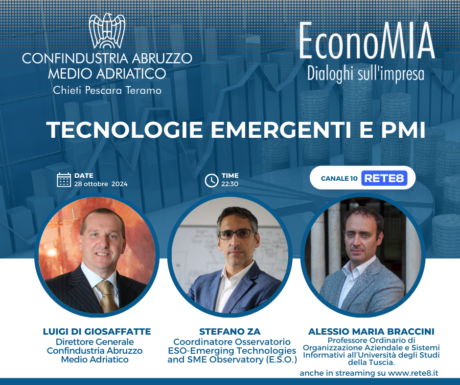 ‘Pmi e Tecnologie Emergenti è il titolo della quarta puntata di “EconoMIA, dialoghi sull’impresa”, format tv di Confindustria Abruzzo Medio Adriatico e Rete 8 in onda il 28 ottobre, alle ore 22:30, sul canale 10 del digitale terrestre