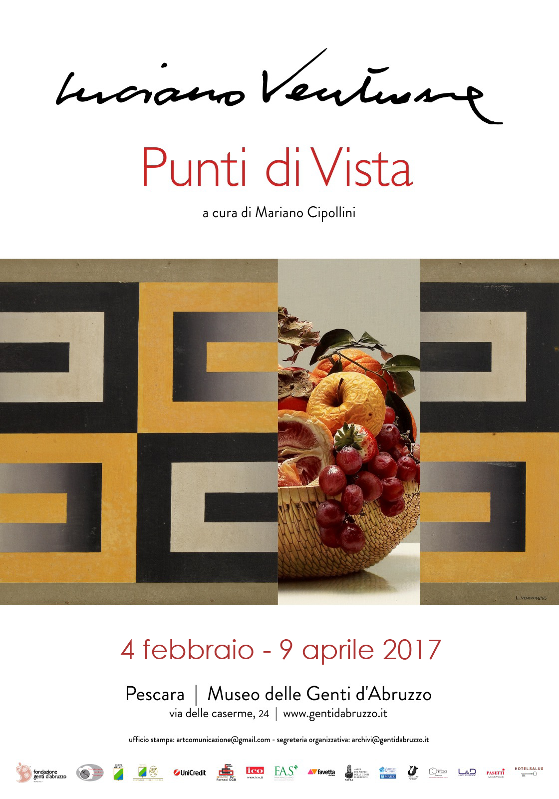 Al Museo delle Genti d’Abruzzo di Pescara, da oggi al 9 aprile, si tiene la mostra “ Punti di vista” dell’artista Luciano Ventrone, curata da Mariano Cipollini e con il patrocinio della Regione Abruzzo, la quale sarà presente con una tela tra le più rappresentative del pittore. L’esposizione, promossa dall’Associazione Archivi Ventrone, ha un nutrito ed importante numero di opere provenienti sia dalla raccolta del maestro sia da collezioni private e pubbliche. Per la prima volta tutte le tredici sale espositive del Museo sono state messe a disposizione di un solo artista.