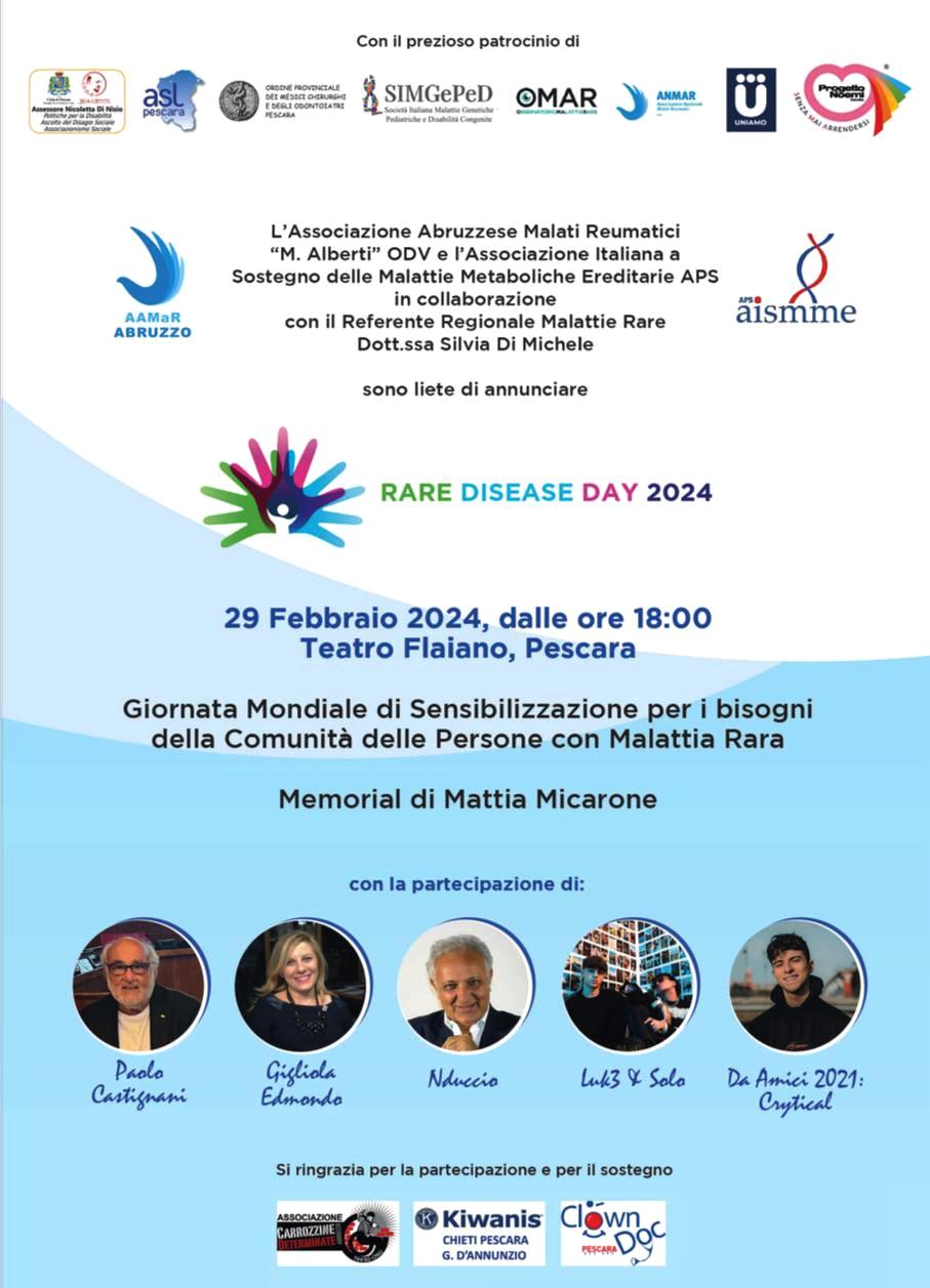 In occasione della Giornata Mondiale delle Malattie Rare, giovedì 29 febbraio, alle ore 18 al Teatro Flaiano di Pescara si terrà un incontro di sensibilizzazione per i bisogni delle Comunità delle persone con Malattie Rare e memorial Mattia Micarone