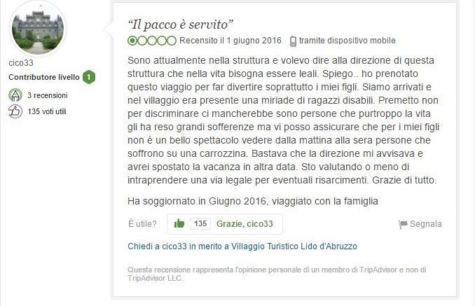 E’ lo stesso presidente di Federalberghi Abruzzo Giammarco Giovannelli a raccogliere l’invito, in seguito alla recensione choc di un “padre di famiglia” che si era lamentato su Trip Advisor per la presenza in un villaggio turistico di Roseto di troppi disabili, brutto spettacolo per i propri figli: