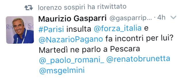 La tensione interna a Forza Italia dopo la “sconfessione” di Berlusconi a Parisi è attestata anche da un tweet di Maurizio Gasparri (che martedì sarà a Pescara), il quale polemizza con l’invito ricevuto da Parisi in Abruzzo da parte del coordinatore regionale di Forza Italia Nazario Pagano: