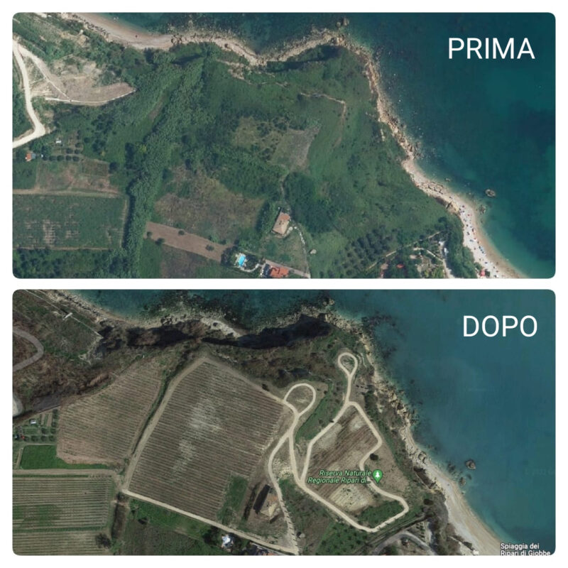 Ci siamo accorti della rilevante trasformazione nell’ambito di una ricerca in corso sui cambiamenti nell’uso del suolo nelle aree protette abruzzesi attraverso il confronto delle foto aeree e satellitari di Google Earth di vari anni e dei portali cartografici nazionale e regionale. Il confronto tra le foto del 2017 e quelle del 2022 è impietoso anche perché parliamo di un’area protetta relativamente piccola, immersa in un territorio, quello costiero, già pesantemente trasformato per scopi agricoli, residenziali e industriali. Abbiamo chiesto se nel tempo sono state concesse tutte le autorizzazioni necessarie per eliminare la vegetazione, alberi compresi, e realizzare le piste sterrate che, tra l’altro, si allontanano anche dall’area che è stata destinata a vigneto interessando anche il bordo della meravigliosa falesia. Qualora siano state rilasciate, chiediamo anche una valutazione della loro legittimità in quanto a nostro avviso è evidente che trasformazioni di ampie porzioni di territorio sviliscono ovviamente la funzione primaria della riserva rispetto alle stesse finalità della legge istitutiva dell’area protetta, la tutela di piante, animali e paesaggio>.