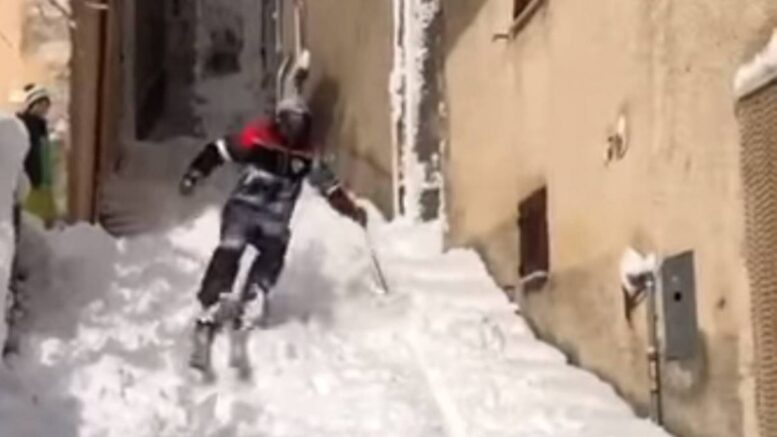 A Rocca di Cambio, con i suoi 1.434 metri di quota il Comune più alto dell’Appennino, si scia tra i vicoli del borgo. Iniziativa, in sicurezza, dei maestri del locale sci club.